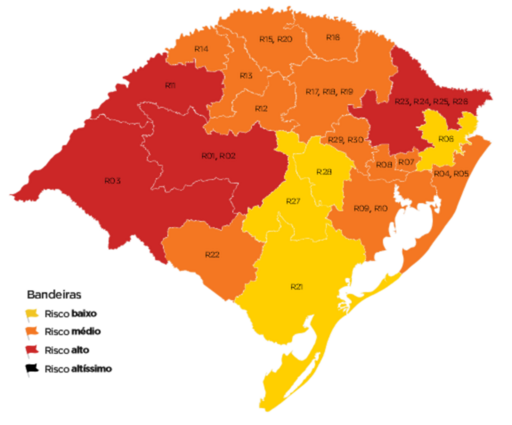 A estratégia utilizada pelo governo entrou em vigor no dia 11 de maio. O Estado foi dividido em 20 regiões e cada uma delas recebe semanalmente uma bandeira que indica se o risco de coronavírus é baixo, médio, alto ou altíssimo, representados pelas bandeiras amarela, laranja, vermelha e preta, respectivamente. Cada cor tem um nível de restrição.