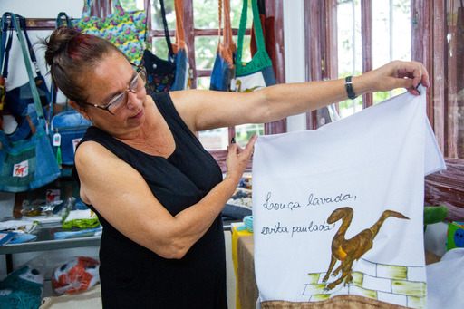 – Começamos com os panos de prato de dino e foi crescendo. Hoje, já temos ecobag, avental e chaveiros. E com o selo, também colocamos a casa como referência para quem vem de fora, recebemos bastante visitações.