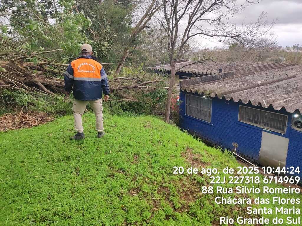 Santa Maria registrou oito ocorrências de destelhamentos em residências nos bairros Salgado Filho, João Goulart, Juscelino Kubitschek e Itararé. Em outro ponto da cidade, uma árvore caiu nos fundos de uma escola no Bairro Chácara das Flores, sem atingir a estrutura principal ou pessoas. Conforme a Defesa Civil, que atendeu aos chamados, não houve necessidade de remoção de moradores e registro de feridos.