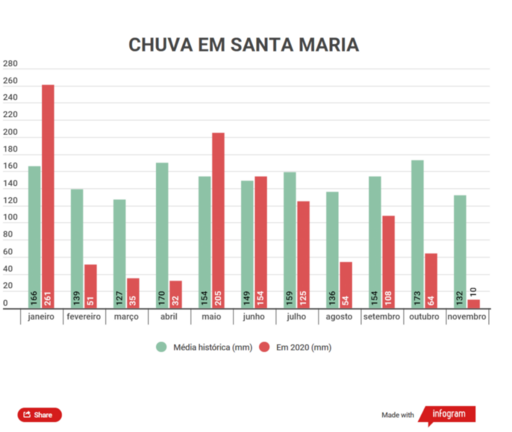 Desde junho, chove abaixo da média em Santa Maria. Conforme o meteorologista Gustavo Verardo, da BaroClima Meteorologia, a média histórica de chuva em outubro é de 173 milímetros. Em 2020, choveu 64 mm, menos da metade. Em novembro, a tendência segue. Até o momento, choveu apenas 10 mm dos 132 da média histórica.