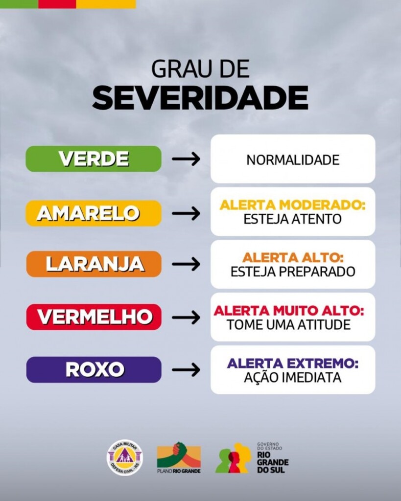 Desde terça-feira (6), a Defesa Civil do Estado passou a utilizar um novo formato de comunicação de alertas à população. As informações sobre o grau de severidade de cada situação agora são apresentadas por meio de uma escala de cores, acompanhadas de orientações sobre o comportamento que a população pode — ou deve — adotar para se proteger.
