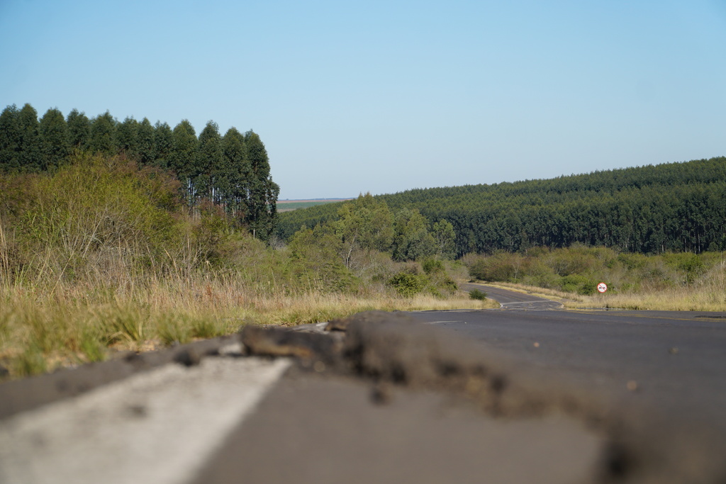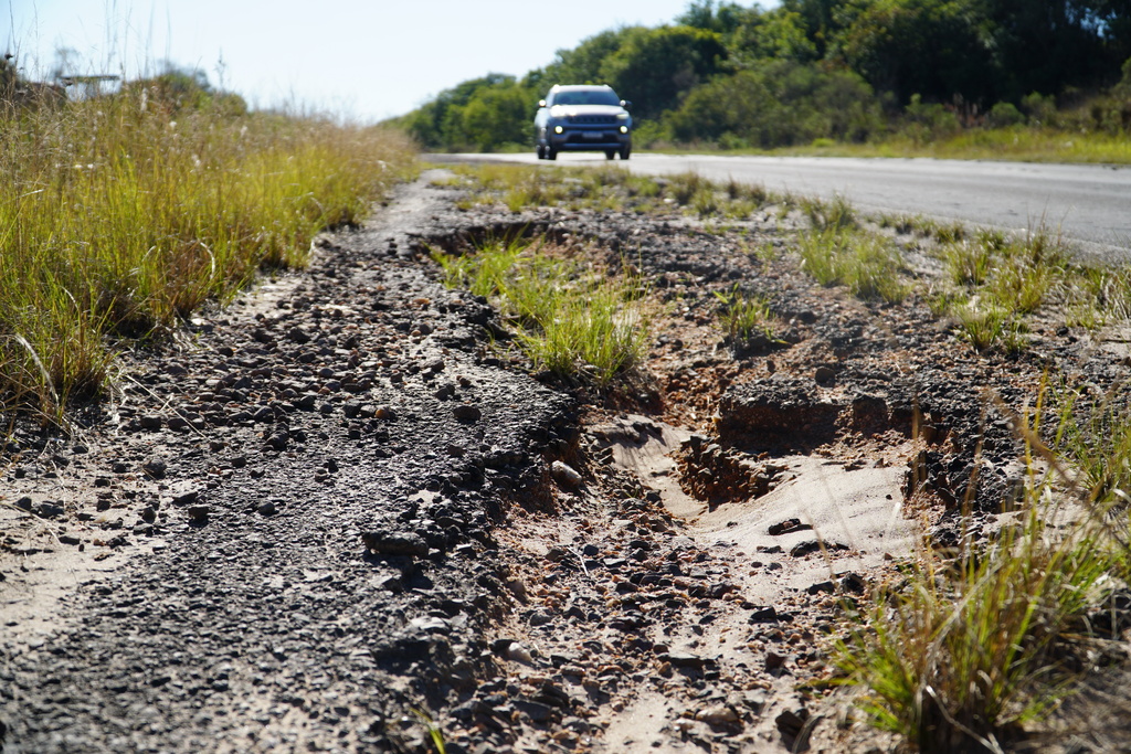 Em diversos trechos, o acostamento é inutilizável. Na chegada à BR-290, por exemplo (foto acima), uma cratera se formou ao lado da pista, oferecendo risco para motoristas em paradas emergenciais, sobretudo à noite, quando a visibilidade é baixa. Em outros pontos, o mato cobre o limite da pista e, em curvas mais acentuadas, fica difícil de visualizar.