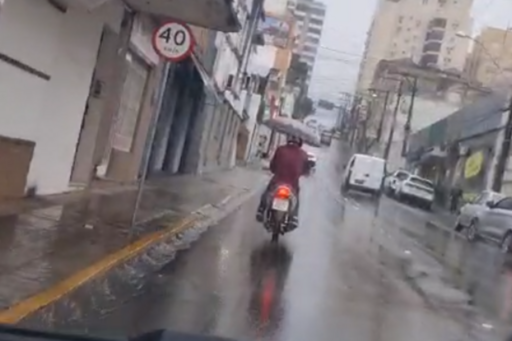Depois do calor dos últimos dias, a chuva foi predominante nesta sexta-feira (18). E com isso, muitas pessoas utilizaram de vários meios para se proteger dela. Um deles, foi um motociclista de Santa Maria que foi flagrado dirigindo com um guarda-chuva aberto. Nas imagens, gravada por um passageiro de um veículo que estava atrás, é possível ver o motorista trafegando pelas ruas com uma mão segurando o guarda-chuva. Ele dirige por alguns metros e para em uma sinaleira.