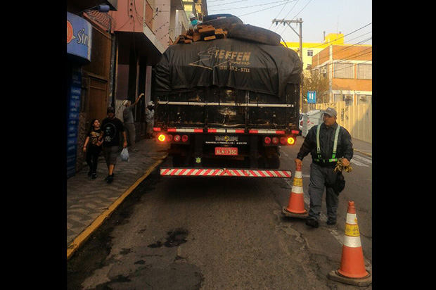 O motorista da carreta disse aos fiscais que se dirigia a uma obra, na Silva Jardim. Fiscais do CMTU fazem a orientação dos motoristas no local.
