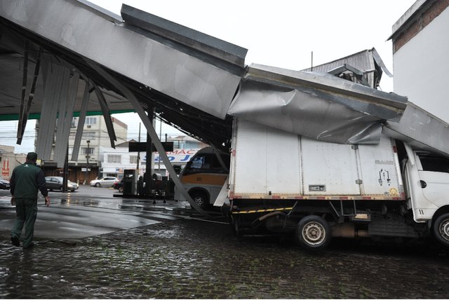 Um morador registrou em vídeo a destruição no Posto Bambino, nas proximidades do Royal Plaza Shopping. Nas imagens feitas por Kauê Flores, é possível ver o telhado do posto, que fica na Avenida Dores, completamente destruído. Veja: