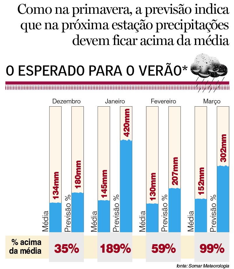 De acordo com Fabiene, as precipitações em fevereiro e março também devem ficar acima da média (veja quadro). No entanto, as temperaturas não devem subir muito, ficando em torno dos 27º C.