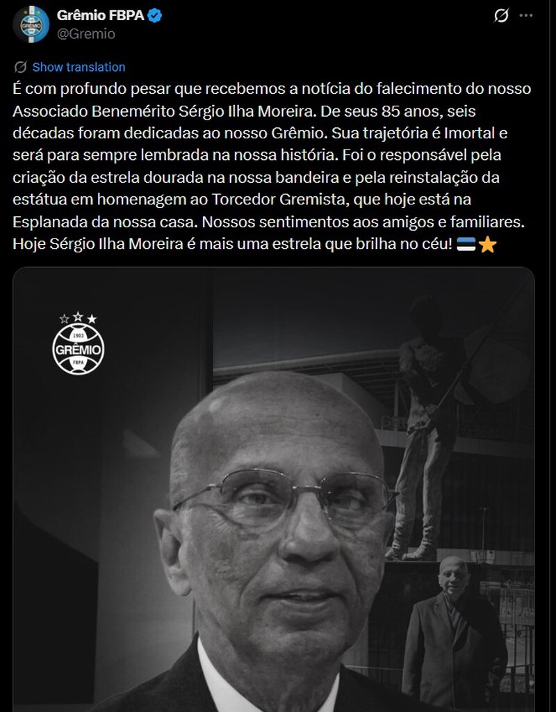 "É com profundo pesar que recebemos a notícia do falecimento do nosso Associado Benemérito Sérgio Ilha Moreira. De seus 85 anos, seis décadas foram dedicadas ao nosso Grêmio. Sua trajetória é Imortal e será para sempre lembrada na nossa história. Foi o responsável pela criação da estrela dourada na nossa bandeira e pela reinstalação da estátua em homenagem ao Torcedor Gremista, que hoje está na Esplanada da nossa casa. Nossos sentimentos aos amigos e familiares. Hoje Sérgio Ilha Moreira é mais uma estrela que brilha no céu! Morreu nesta quinta-feira (29), aos 85 anos, o ex-dirigente e conselheiro jubilado do Grêmio Sérgio Ilha Moreira. Ao longo de sua trajetória, ele atuou no Tricolor como vice-presidente, conselheiro, assessor e diretor. Em 2025 recebeu o título de Associado Benemérito."