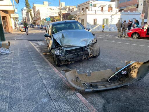 Dois carros colidiram no cruzamento entre as Ruas Conde de Porto Alegre e Dos Andradas no centro de Santa Maria por volta das 17h desta terça-feira (13). Uma idosa de 72 anos, que estava na carona de um dos veículos, ficou ferida e levada para o Pronto Atendimento Municial (PA) no Bairro Patronato.