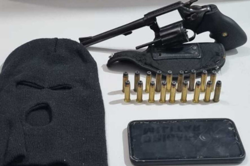 Os relatos indicaram que o suspeito estaria portando uma arma de fogo e circulando em um veículo pela área central da cidade. Após avistar a viatura, fugiu pelas ruas do município. Foi apreendido um revólver calibre 357, 18 munições calibre, uma touca ninja, um coldre de pano e um celular.