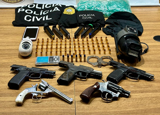 No total, foram apreendidos dois revólveres Taurus calibre 38, duas pistolas Bersa calibre 9 mm, uma pistola Taurus G3, seis carregadores, 83 munições intactas de calibre 9 mm, seis munições intactas de calibre 38, um par de algemas, uma balança de precisão, duas câmeras de monitoramento, quatro camisetas da Polícia Civil, duas balaclavas, um saco com diversos pinos e um aparelho celular.
