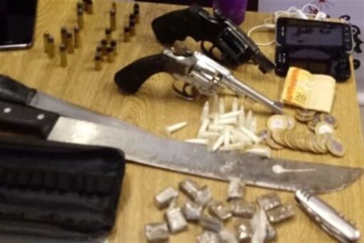 A BM encontrou no chão da casa dois cartuchos calibre 38, segundo o Boletim de Ocorrência. Próximo aos cartuchos, a BM localizou um alçapão na residência, onde dentro estavam dois revólveres calibre 38, nove cartuchos calibre 38 longos, sendo um com espoleta batida. Segundo a polícia, a espoleta é a parte da munição que armazena o material detonante do projétil, como a pólvora. A espoleta batida pode ser pela troca desta parte de uma velha por uma nova.