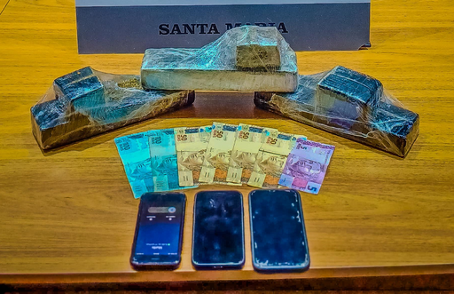 Dentro do automóvel, foi localizado e apreendido uma mochila contendo aproximadamente 3 kg de maconha, um carregador de celular e R$ 405, além dos aparelhos celulares dos suspeitos.