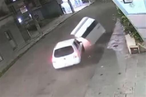 Um veículo de cor branca, ainda não identificado, colidiu contra um Renault Sandero que estava estacionado na Rua Floriano Peixoto, próximo à esquina com a Rua Vale Machado, em Santa Maria e logo após bateu em um contêiner da coleta de lixo. O acidente ocorreu na noite de terça-feira (13) e foi registrado por câmeras de segurança.