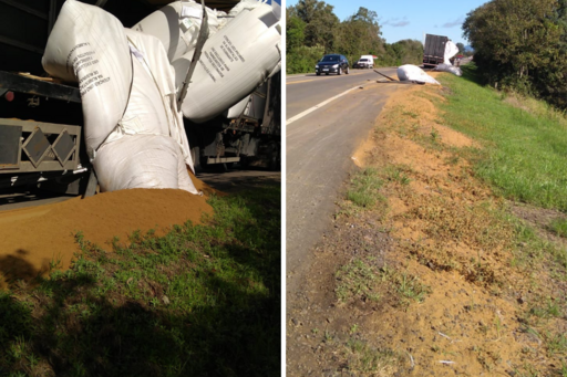 De acordo com a Rádio Integração, um caminhão que trafegava pela via teve parte da carga tombada. Ele transportava farelo de ração animal, que ficou espalhado no acostamento.