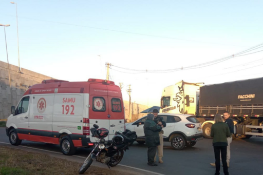 Uma colisão, envolvendo um carro e uma moto, por volta das 7h desta terça-feira (15), deixou o trânsito lento na Avenida Helvio Basso, próximo a rotatória da Uglione, que dá acesso a BR-392.