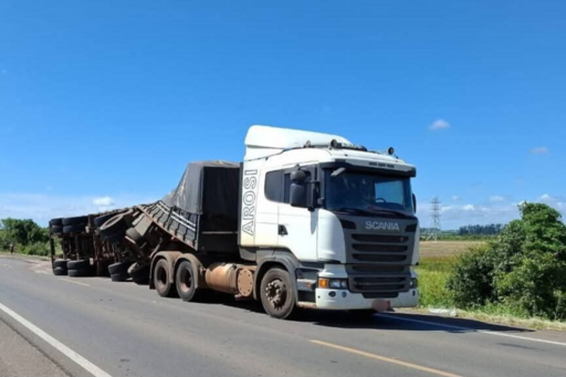 Os semirreboques do conjunto tombaram e derramaram parte da carga na pista. Não foi informado o que era transportado. Ninguém ficou ferido.