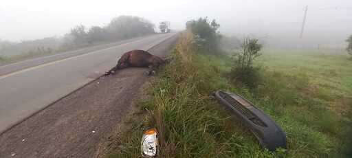 Uma cavalo morreu e pelo menos dois veículos ficaram danificados em um acidentes no final da madrugada de segunda-feira (19), na BR-287, em São Pedro do Sul.  O acidente envolveu uma carreta, uma van e um carro Fiesta. As cidades das placas dos veículos não foram informadas.