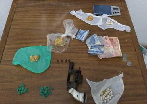 Com eles, a Polícia Civil encontrou uma balança de precisão, 171 pedras pequenas de craque, 3 pedras grandes, um revólver .32 municiado.
