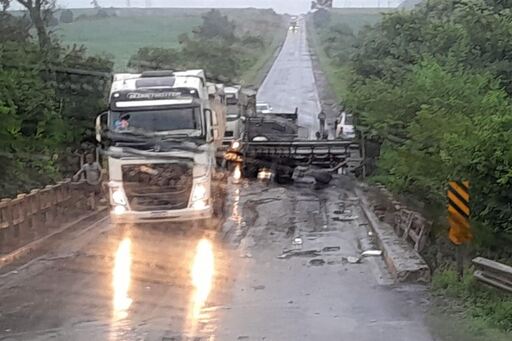 Acidente envolvendo três caminhos e um carro foi sobre a ponte da localidade de Passo dos Buracos