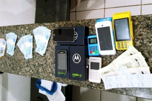 Máquinas de cartão, dinheiro, celulares e cartões de crédito foram apreendidos com a dupla de estelionatários