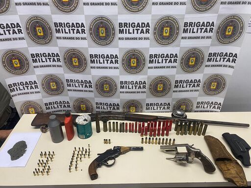 No pátio da casa, foram encontrados e apreendidos um revólver calibre 32, da marca Rossi, com munições, e um revólver calibre 38, Taurus, contendo cinco projéteis intactos e um deflagrado. Dentro da residência, os policiais apreenderam uma garrucha calibre 22 e diversas munições intactas e deflagradas de vários calibres, além de 104 gramas de pólvora.