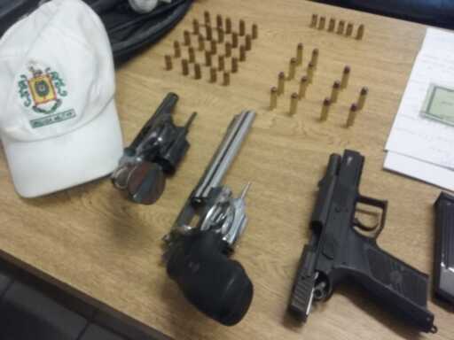 Um homem de 32 anos foi preso em flagrante com uma pistola, dois revólveres e munições durante uma ocorrência de lei Maria da Penha, na tarde de ontem, em Santa Maria. Ele estava na frente da casa da ex-companheira, na Vila Nossa Senhora do Trabalho, quando ela acionou a polícia.