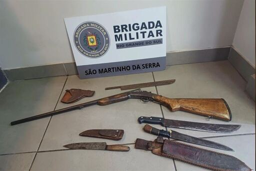 Após o atendimento, os policiais se deslocaram até a casa do suspeito, onde realizaram a prisão em flagrante. No imóvel, foram apreendidos uma espingarda calibre 20, três facões, uma faca e uma bainha de couro.