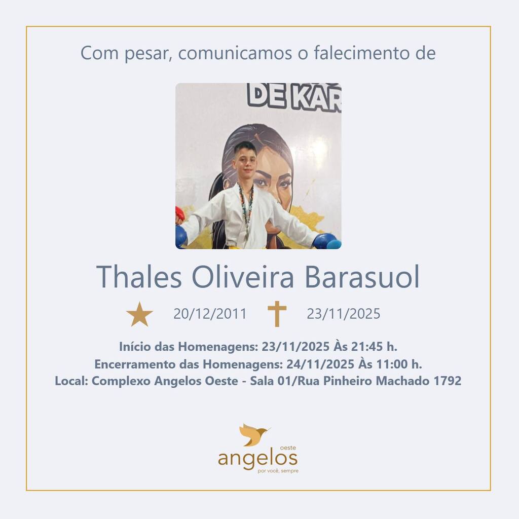 Foi identificado como Thales Oliveira Barasuol, de 13 anos, o adolescente que morreu afogado em uma piscina em Cruz Alta, Região Noroeste. A vítima morreu na tarde deste domingo (23) após submergir na piscina do clube localizado na Rua Carlos Frederico Brum, no Bairro Jardim Petrópolis.