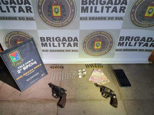 Junto com ele, foram apreendidos dois revólveres, sendo um calibre 38 e outro calibre 32, ambos com munição. Também foram encontradas 54 porções de crack, sete porções de maconha, um aparelho de celular e R$ 60 em dinheiro.