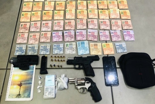 De acordo com a ocorrência, ao ser abordado e revistado, o jovem estava na posse de uma pistola Taurus modelo G2C, um revólver calibre .38, dez munições calibre 9mm, quatro munições calibre .38, um carregador de pistola, quatro porções de cocaína, uma porção de maconha, uma balança de precisão, um celular, um coldre e R$ 39.664.