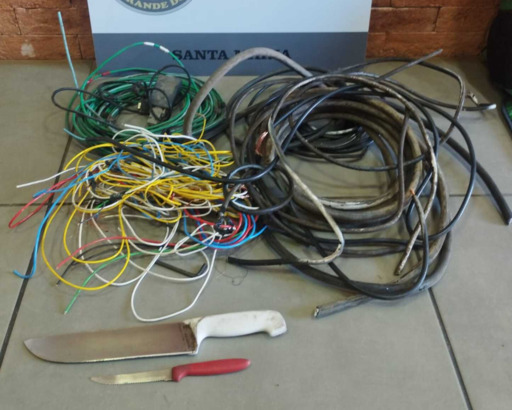 Foram feitas buscas no interior do estabelecimento. No fundo do local, escondido atrás de uma plantadeira, o suspeito foi encontrado abraçado em uma mochila laranja com verde. Dentro dela, haviam fios de cobre, encanamentos e duas facas.