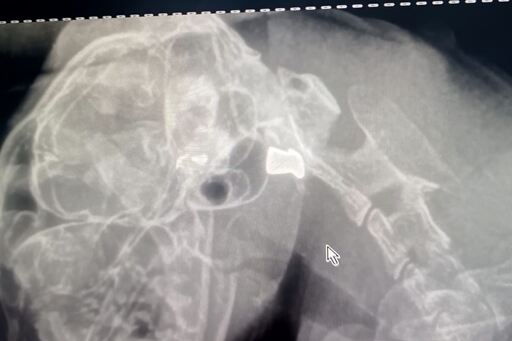 Após exames, foi constatado que o animal havia sido atingido por um tiro no ouvido, com o projétil ainda alojado.