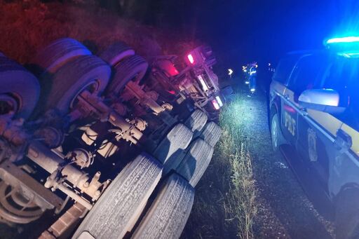 Carreta carregada de adubo tombou na madrugada desta sexta-feria em Santana do Livramento