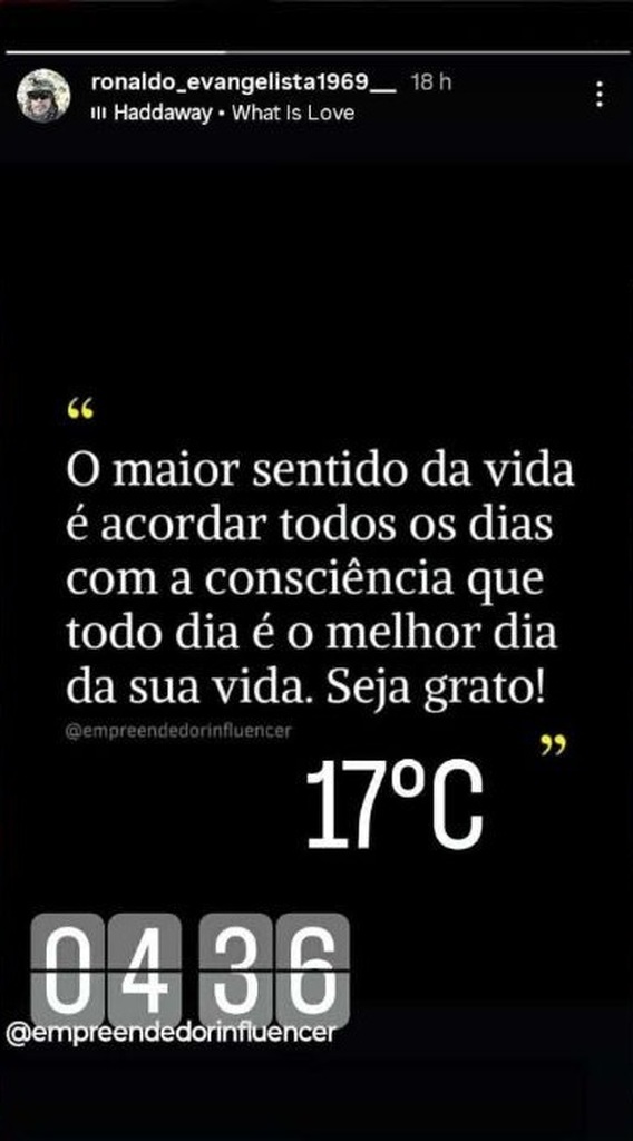 O que chamou a atenção de familiares, amigos e conhecidos foi a última publicação feita por Evangelista em seu status de rede social às 4h36min, cerca de duas horas antes da viagem de Santiago a Santa Maria, para trazer dois passageiros. Na mensagem, ele compartilhou, em seus stories, uma reflexão sobre a importância da gratidão. Confira:
