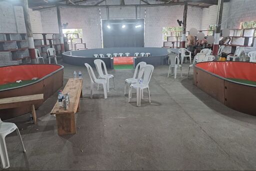 O local da rinha, organizado para a prática ilegal, apresentava trêsringues de disputa, arquibancadas e uma estrutura completa para o evento.