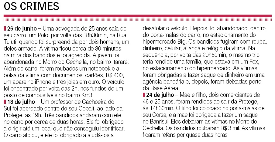 Conforme o delegado, o suspeito é foragido do sistema prisional pela prática de roubos similares e um homicídio. Nos crimes praticados neste ano, em Santa Maria, as vítimas foram feitas reféns e colocadas nos porta-malas dos veículos enquanto o jovem, armado, efetuava os roubos. A prática acabou sendo conhecida como sequestro relâmpago, embora a polícia não use a expressão.