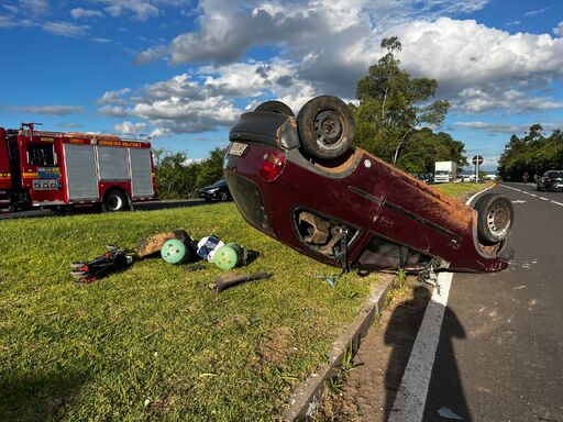 Um carro capotou ao colidir com um ônibus do transporte coletivo, na tarde desta quarta-feira (5), na RSC-287, a Faixa Nova de Camobi, em Santa Maria. O acidente aconteceu por volta das 16h50min. Quatro pessoas que estavam no automóvel ficaram feridas e foram levadas para atendimento.