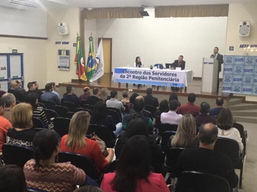 Servidores da Superintendência dos Serviços Penitenciários (Susepe) estiveram reunidos em Santa Maria, durante toda a sexta-feira, para o Encontro dos Servidores da 2ª Região Penitenciária. Ao todo, 140 agentes compareceram ao auditório do Sest Senat. Os servidores assistiram palestras com temas como saúde e direitos do servidor penitenciário. Houve ainda sorteio de brindes e apresentação artística. O evento contou com a presença do superintendente da Susepe, Ângelo Carneiro. O encontro é alusivo ao Dia do Servidor Penitenciário, celebrado dia 12 de setembro.