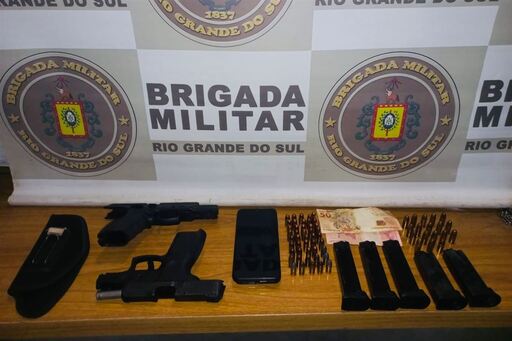 Com eles foi localizado e apreendido duaspistolas calibres 9mm e 380, dois carregadores calibre 9mm, três carregadores calibre 380, 45 munições 380, 18 munições 9mm, dois aparelhos celulares, um coldre, uma mochila e R$ 60.