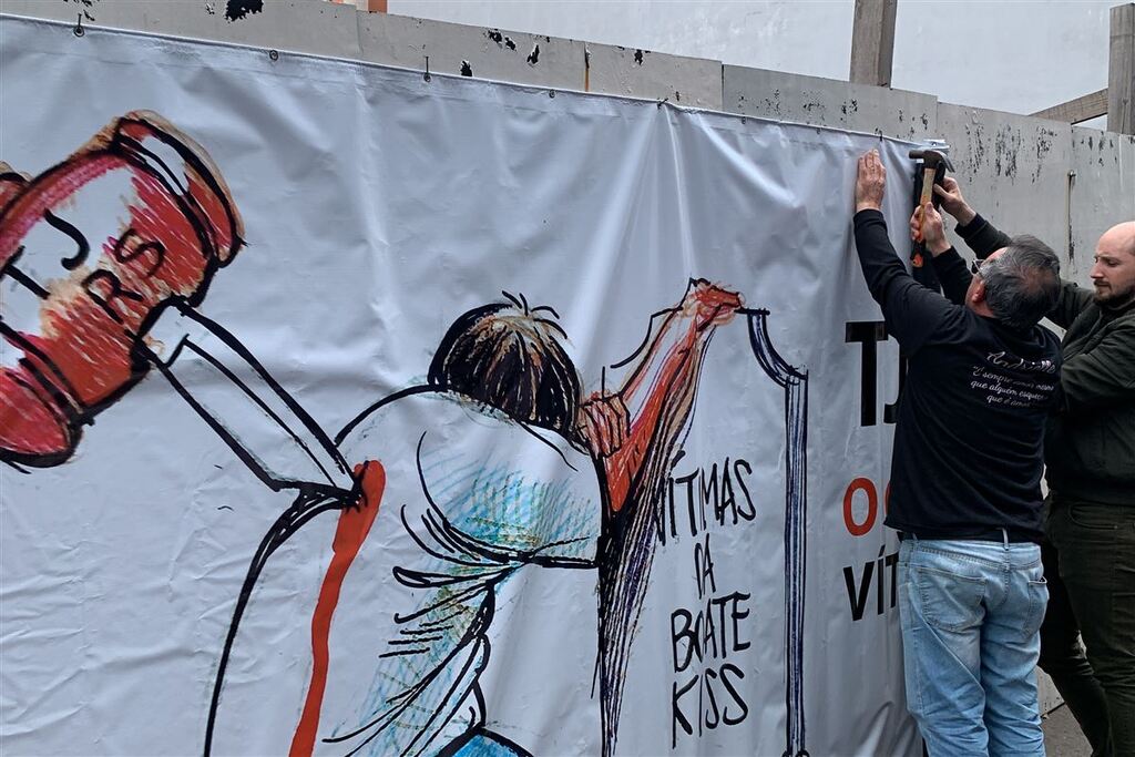 Diversas pessoas que compõem a associação estavam presentes no ato. No banner instalado pelos familiares, uma ilustração do cartunista carioca Carlos Latuff mostra um homem abaixado, escorado em uma lápide e com o martelo da justiça cravado nas costas. A imagem traz os dizeres: “Vítimas da boate kiss”. No mesmo espaço, uma crítica à recente decisão do Tribunal de Justiça do Rio Grande do Sul (TJRS): “TJRS, o carrasco das vítimas da kiss”.