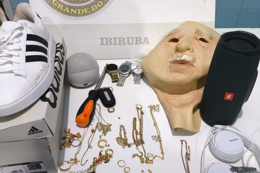 Durante a abordagem, os militares encontraram com ele joias e relógios semelhantes aos levados na ação criminosa. No interior do carro, também foram apreendidos tênis, caixa de som, óculos e uma carteira. Um dos itens chamou a atenção dos policiais: uma máscara de borracha que imita o rosto de um idoso, com bigode e sobrancelhas brancas. O disfarce inclusive pode ter sido usado nos furtos, segundo relatos.
