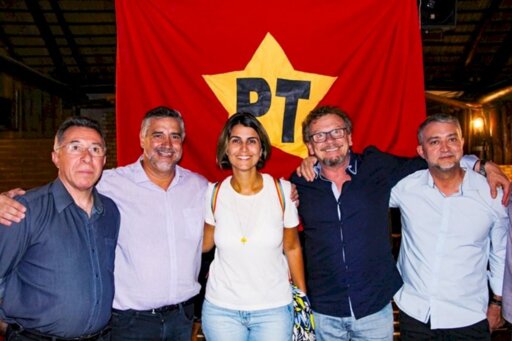 Foto: Guto Guterres, divulgação/No jantar de posse, o deputado Pimenta ao lado do deputado Valdeci Oliveira (à esq.), da ex-deputada Manuela D'Ávila e dos deputados Luiz Fernando Mainardi (segundo, a partir  da dir.) e Edgar Pretto (à dir.)
