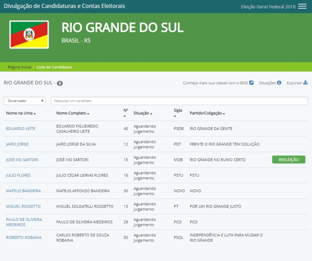 4. A lista com todos os candidatos a governador aparece na tela. Os postulantes estão organizados por ordem alfabética. Nesta tela, já é possível ver o nome completo, situação do pedido de candidatura, a sigla e o nome da coligação do candidato
