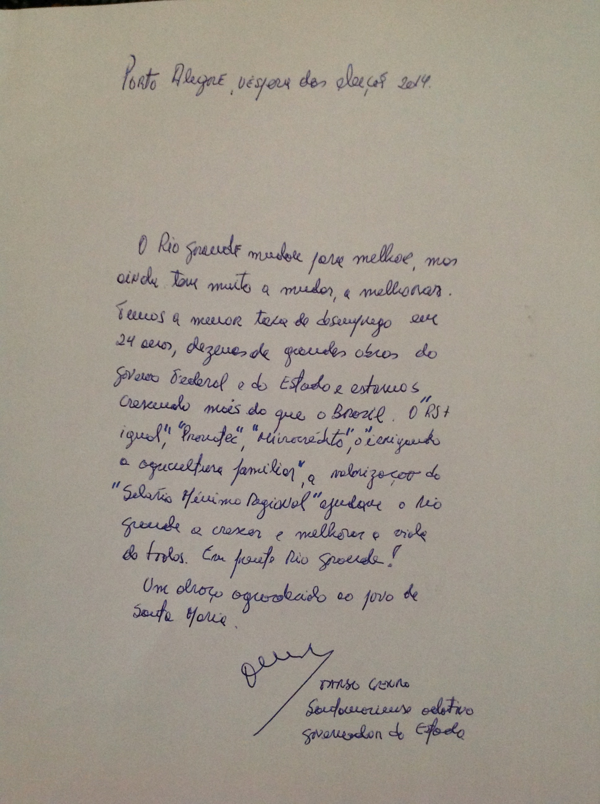 "O Rio Grande mudou para melhor, mas ainda tem muito a mudar, a melhorar. Temos a menor taxa de desemprego em 24 anos, dezenas de grandes obras do Governo Federal e do Estado e estamos crescendo mais do que o Brasil. O "RS + Igual", "Pronatec", "Microcrédito", o "Irrigando a Agricultura Familiar", a valorização do "Salário Mínimo Regional" ajudaram o Rio Grande a crescer e melhorar a vida de todos. Em frente Rio Grande!
