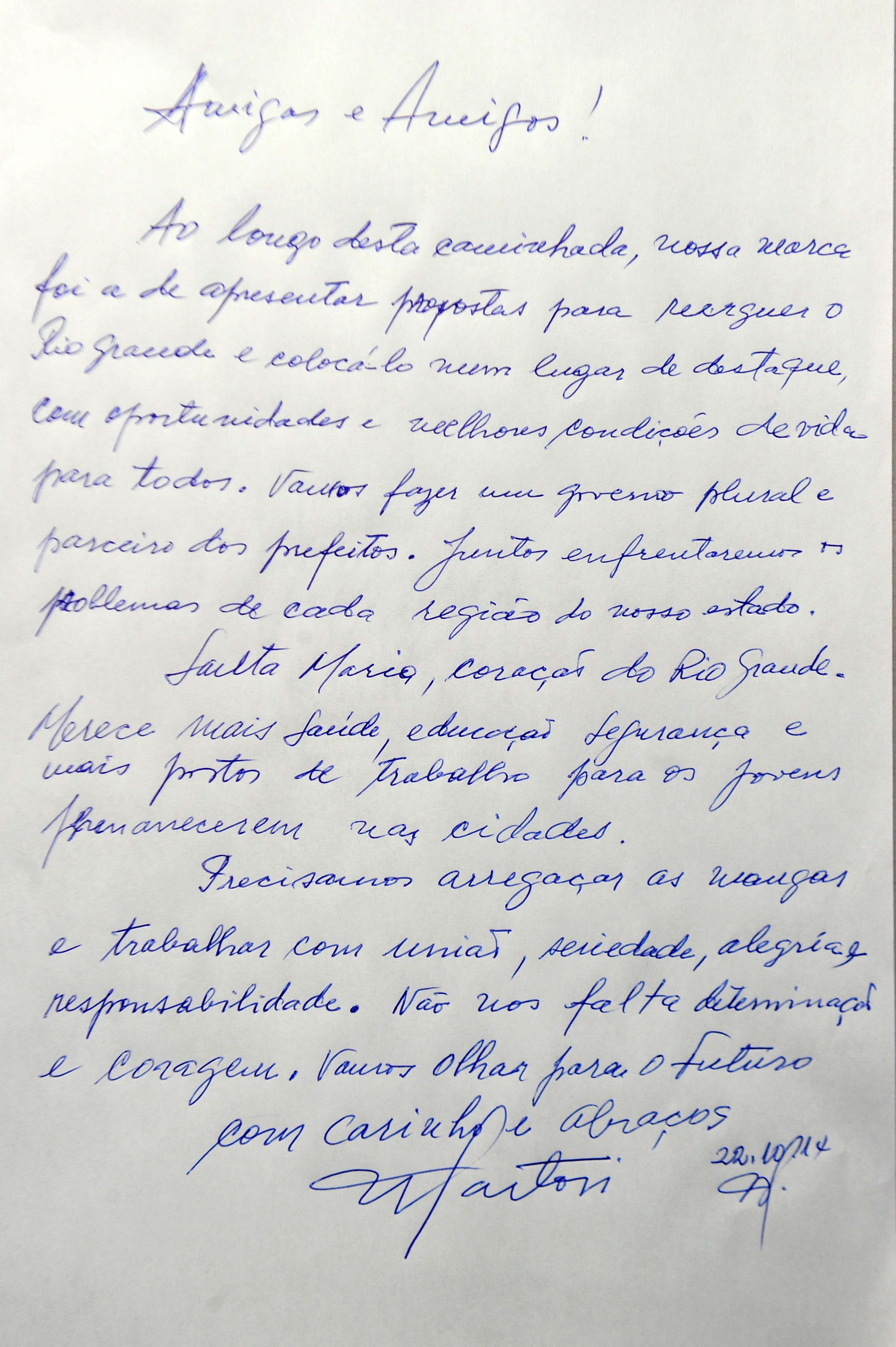 Na reta final para o segundo turno, o "Diário" pediu a José Ivo Sartori (PMDB) e a Tarso Genro (PT), candidatos ao governo do Estado, que mandassem uma carta aos eleitores santa-marienses. A ideia era que ambos escrevessem, à mão, o recado que desejavam dar à cidade, às vésperas do momento decisivo das urnas. Ambos aceitaram a proposta e, logo abaixo, você confere o que os candidatos escreveram para Santa Maria.