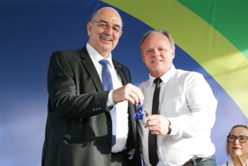 Prefeito de São Sepé, Leocarlos Girardello (PP) foi pessoalmente buscar o micro-ônibus (na foto, à dir., recebendo as chaves de Terra), junto com o motorista da administração municipal. O chefe do Executivo contou que a prefeitura solicitou o veículo em outubro do ano passado ao ministério. O micro-ônibus, conforme Girardello, foi destinado ao Conselho de Referência da Assistência Social (Cras), contudo a prefeitura pediu autorização para repassar à Associação de Pais e Amigos dos Excepcionais (Apae), que necessitava de um veículo. "A Apae tem uma van que está estouradinha, de 2007", justificou o prefeito.