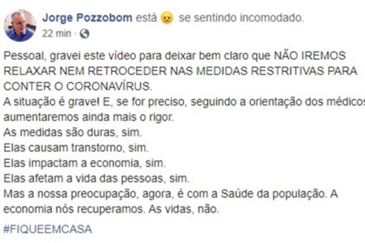 O prefeito Jorge Pozzobom foi direto no pedido para que as medidas preventivas não sejam abandonadas. Em vídeo, ele citou as medidas já adotadas em Santa Maria, como suspensão de aulas e restrições nas linhas de ônibus, a necessidade de mantê-las e dados alarmantes do coronavírus no Brasil e na cidade.