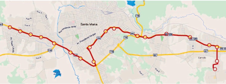 A prefeitura de Santa Maria finalizou o projeto do ônibus rápido (BRT) que vai cortar Santa Maria de leste-oeste. Com 43,2 quilômetros de extensão, a linha - que vai receber veículos híbridos (que funcionarão por eletricidade ou a diesel) - vai ligar três grandes regiões da cidade: Tancredo Neves, Centro e Camobi. Pelo estudo do Instituto de Planejamento, órgão do governo municipal que trabalhou no projeto, a linha deve ter 20 estações, com distância mínima de 600 a 700 metros, que vão ser percorridas em um tempo máximo de 65 minutos por 18 veículos, alguns com até 120 lugares.