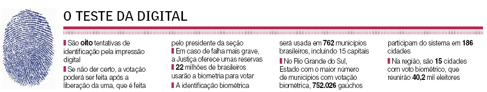 No segundo turno, a identificação do eleitor a partir da impressão digital será utilizada por apenas 6% dos 140 milhões de eleitores do país. Na região, 40.173 eleitores de cidades que têm entre 2 e 14 mil habitantes voltarão a ser identificados pela biometria. O sistema será adotado, novamente, em Dilermando de Aguiar, Dona Francisca, Formigueiro, Itaara, Itacurubi, Ivorá, Jari, Quevedos, São João do Polêsine, São Martinho da Serra, Santa Margarida do Sul, Silveira Martins, Toropi, Unistalda e Vila Nova do Sul.