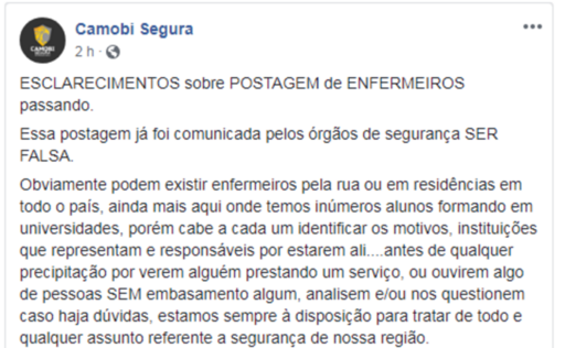 Tanto a Brigada Militar quanto a Associação Camobi Segua confirmaram ao Diário, na quarta-feira, que as informações são falsas. Qualquer dúvida ou informação podem ser obtidas com a BM pelos telefones 190 ou (55) 3217-5756.